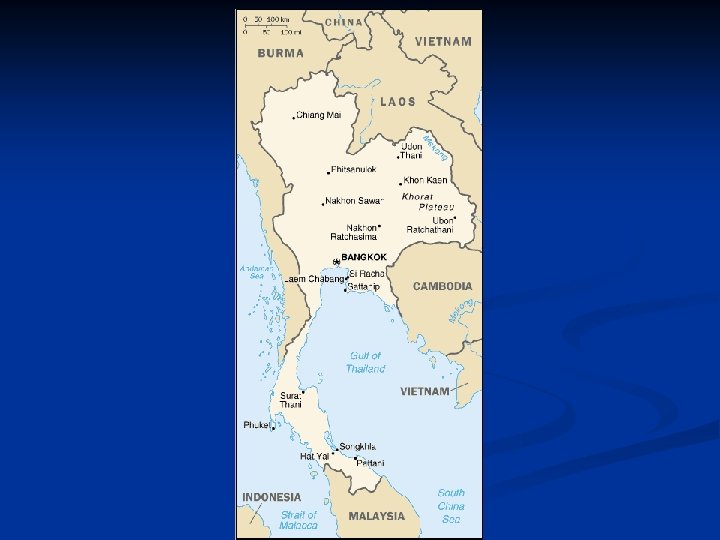 Important Facts n One of the top destinations (with China, Hong Kong and Malaysia) in Asia and Pacific 10, 9 million international tourist arrivals (4 th highest in the region; after China, Hong and Malaysia) n $7, 9 billion international tourism receipts (3 rd highest) (WTO, 2003) n Coastline: 3, 219 km n Terrain: central plain; Khorat Plateau in the east; mountains elsewhere n