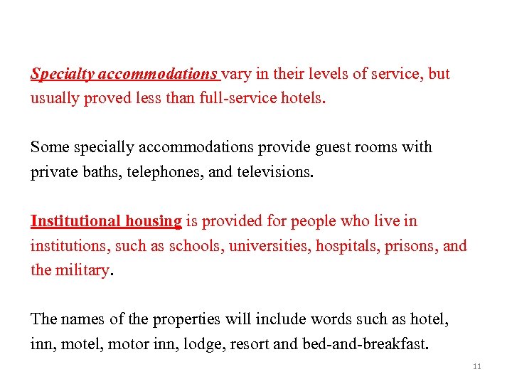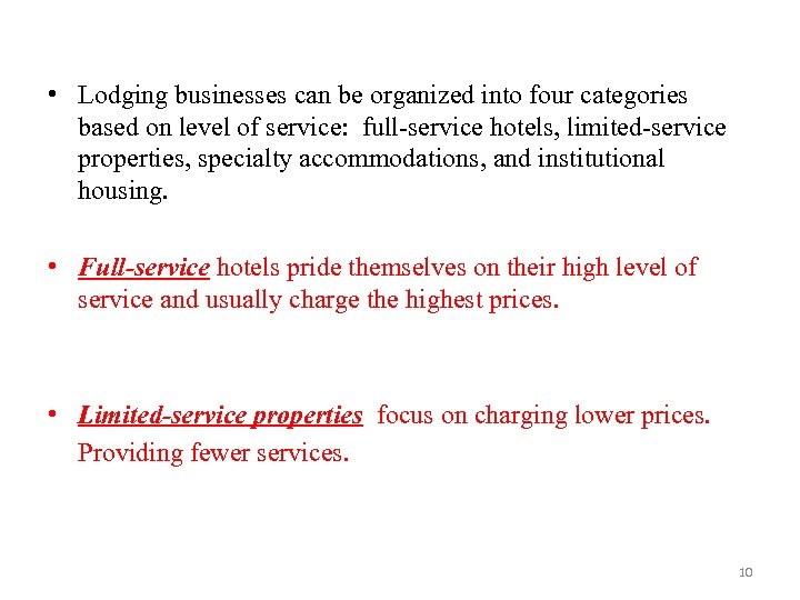 • Lodging businesses can be organized into four categories based on level of service: full-service hotels, limited-service properties, specialty accommodations, and institutional housing. • Full-service hotels pride themselves on their high level of service and usually charge the highest prices. • Limited-service properties focus on charging lower prices. Providing fewer services. 10
