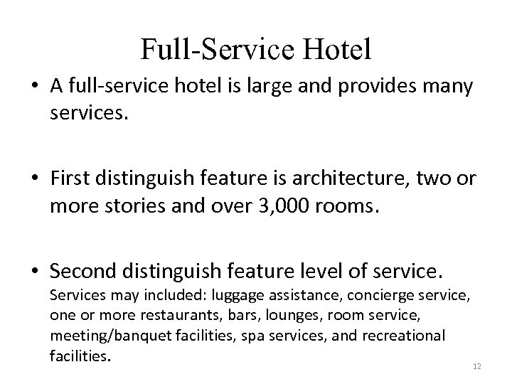 Full-Service Hotel • A full-service hotel is large and provides many services. • First distinguish feature is architecture, two or more stories and over 3, 000 rooms. • Second distinguish feature level of service. Services may included: luggage assistance, concierge service, one or more restaurants, bars, lounges, room service, meeting/banquet facilities, spa services, and recreational facilities. 12