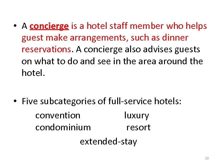 • A concierge is a hotel staff member who helps guest make arrangements, such as dinner reservations. A concierge also advises guests on what to do and see in the area around the hotel. • Five subcategories of full-service hotels: convention luxury condominium resort extended-stay 13