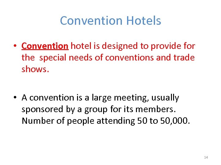 Convention Hotels • Convention hotel is designed to provide for the special needs of conventions and trade shows. • A convention is a large meeting, usually sponsored by a group for its members. Number of people attending 50 to 50, 000. 14