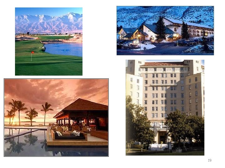 Resort Hotels • Resort hotel caters to the vacationer or leisure traveler. • A resort is a place that provides entertainment, recreation, and relaxation for vacationers. • Located near seashores, mountains, and hot springs. 18