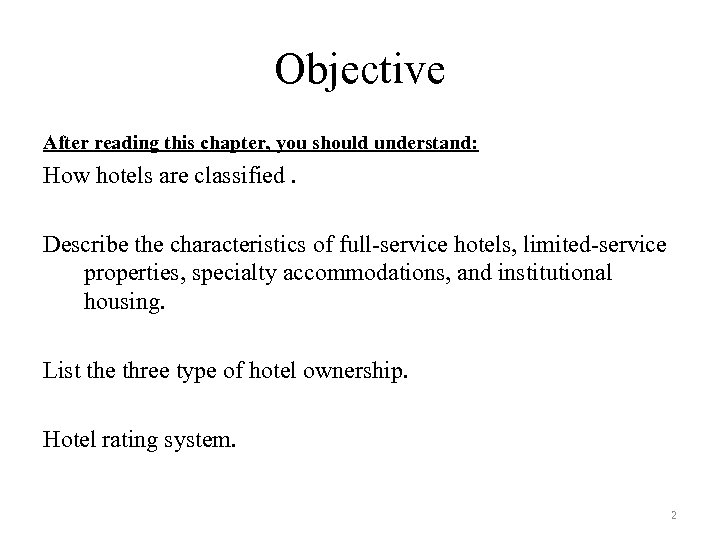 Objective After reading this chapter, you should understand: How hotels are classified. Describe the characteristics of full-service hotels, limited-service properties, specialty accommodations, and institutional housing. List the three type of hotel ownership. Hotel rating system. 2