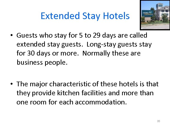 Extended Stay Hotels • Guests who stay for 5 to 29 days are called extended stay guests. Long-stay guests stay for 30 days or more. Normally these are business people. • The major characteristic of these hotels is that they provide kitchen facilities and more than one room for each accommodation. 20
