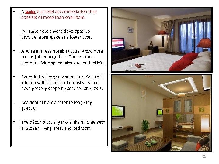 • A suite is a hotel accommodation that consists of more than one room. • All suite hotels were developed to provide more space at a lower cost. • A suite in these hotels is usually tow hotel rooms joined together. These suites combine living space with kitchen facilities. • Extended-&-long stay suites provide a full kitchen with dishes and utensils. Some have grocery shopping service for guests. • Residential hotels cater to long-stay guests. • The décor is usually more like a home with a kitchen, living area, and bedroom 21