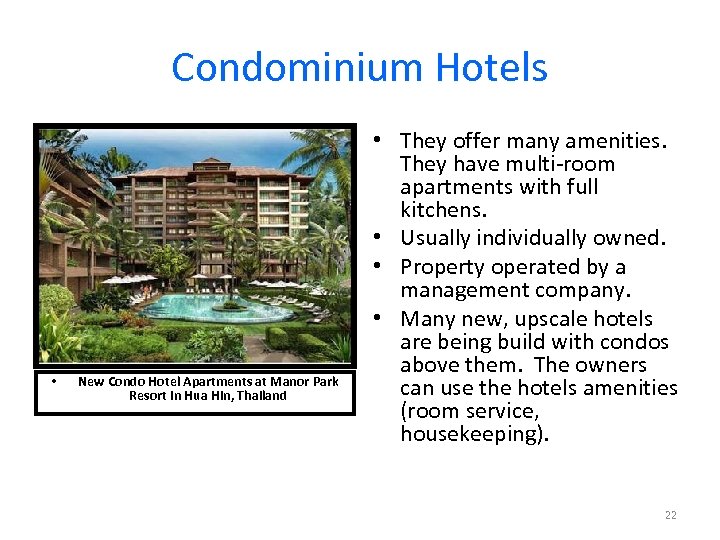 Condominium Hotels • New Condo Hotel Apartments at Manor Park Resort in Hua Hin, Thailand • They offer many amenities. They have multi-room apartments with full kitchens. • Usually individually owned. • Property operated by a management company. • Many new, upscale hotels are being build with condos above them. The owners can use the hotels amenities (room service, housekeeping). 22
