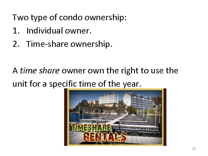 Two type of condo ownership: 1. Individual owner. 2. Time-share ownership. A time share owner own the right to use the unit for a specific time of the year. 24