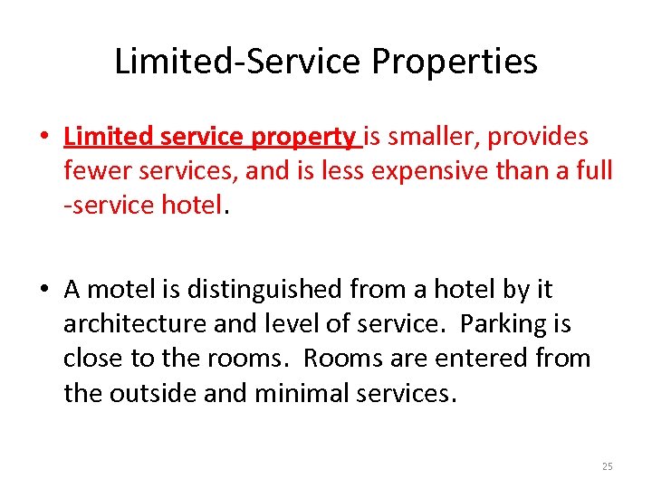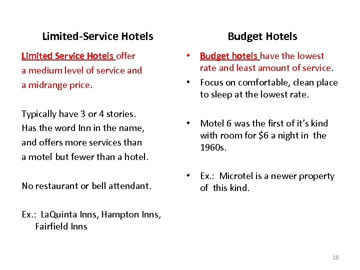 Inns refer to smaller hotels. Offer fewer amenities. Limited service properties are organized into two categories: limited service hotels budget hotels 27