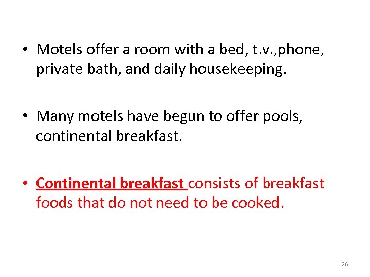 • Motels offer a room with a bed, t. v. , phone, private bath, and daily housekeeping. • Many motels have begun to offer pools, continental breakfast. • Continental breakfast consists of breakfast foods that do not need to be cooked. 26
