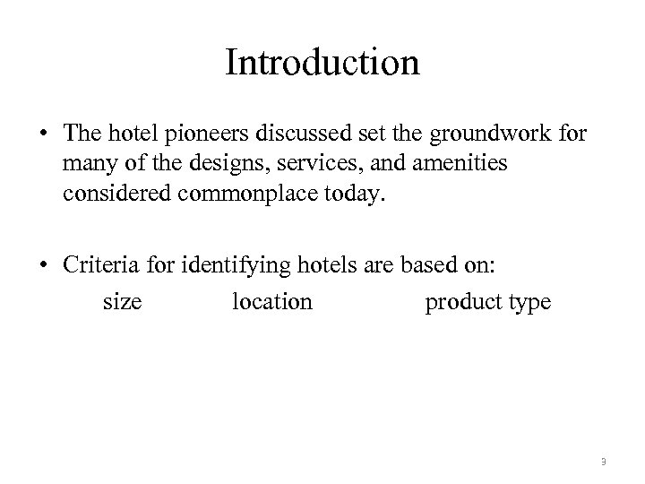 Introduction • The hotel pioneers discussed set the groundwork for many of the designs, services, and amenities considered commonplace today. • Criteria for identifying hotels are based on: size location product type 3
