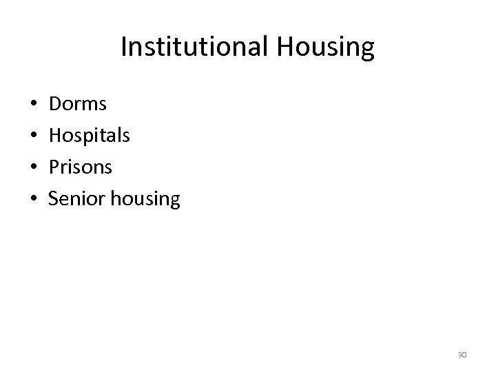 Institutional Housing • • Dorms Hospitals Prisons Senior housing 30