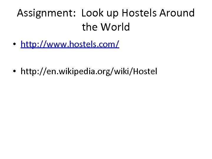 Assignment: Look up Hostels Around the World • http: //www. hostels. com/ • http: //en. wikipedia. org/wiki/Hostel