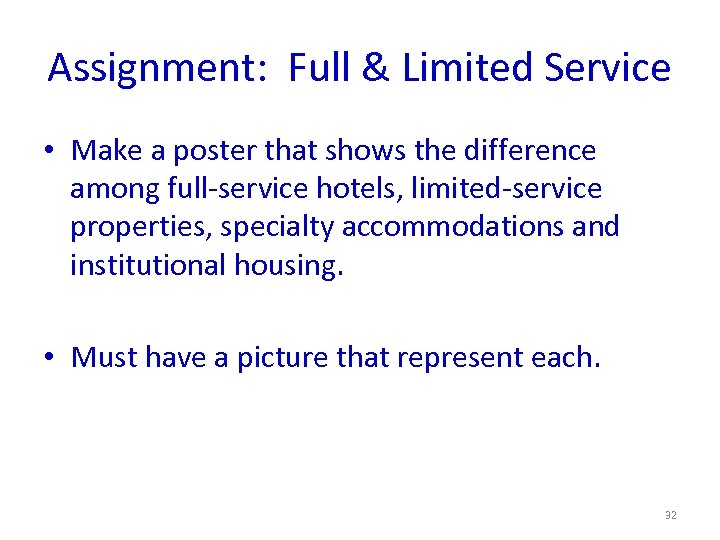 Assignment: Full & Limited Service • Make a poster that shows the difference among full-service hotels, limited-service properties, specialty accommodations and institutional housing. • Must have a picture that represent each. 32