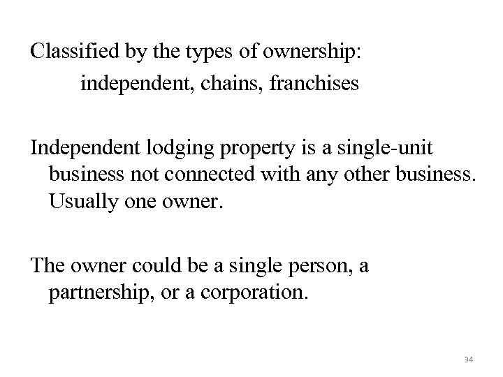 Classified by the types of ownership: independent, chains, franchises Independent lodging property is a single-unit business not connected with any other business. Usually one owner. The owner could be a single person, a partnership, or a corporation. 34