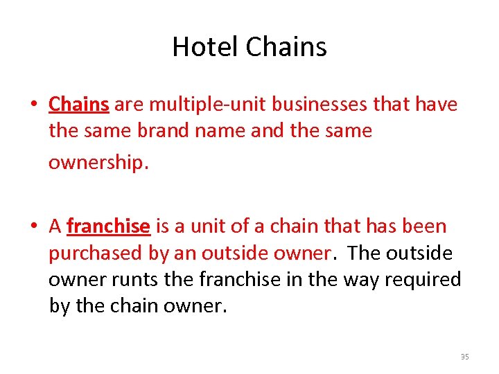 Hotel Chains • Chains are multiple-unit businesses that have the same brand name and the same ownership. • A franchise is a unit of a chain that has been purchased by an outside owner. The outside owner runts the franchise in the way required by the chain owner. 35