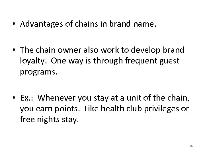 • Advantages of chains in brand name. • The chain owner also work to develop brand loyalty. One way is through frequent guest programs. • Ex. : Whenever you stay at a unit of the chain, you earn points. Like health club privileges or free nights stay. 36