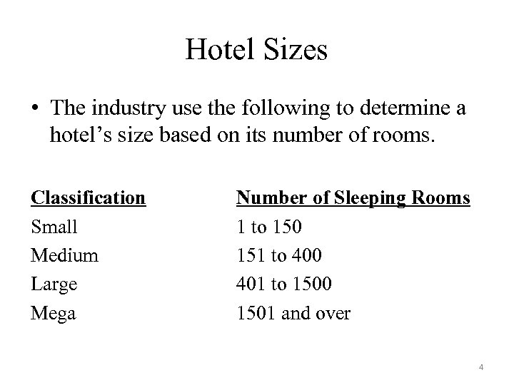 Hotel Sizes • The industry use the following to determine a hotel’s size based on its number of rooms. Classification Small Medium Large Mega Number of Sleeping Rooms 1 to 150 151 to 400 401 to 1500 1501 and over 4