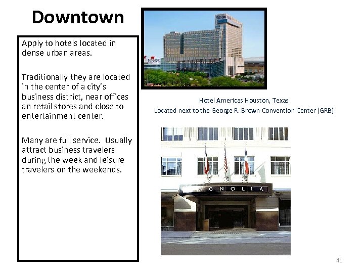 Downtown Apply to hotels located in dense urban areas. Traditionally they are located in the center of a city’s business district, near offices an retail stores and close to entertainment center. Hotel Americas Houston, Texas Located next to the George R. Brown Convention Center (GRB) Many are full service. Usually attract business travelers during the week and leisure travelers on the weekends. 41