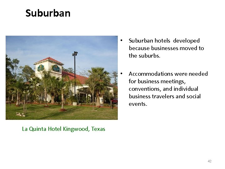 Suburban • Suburban hotels developed because businesses moved to the suburbs. • Accommodations were needed for business meetings, conventions, and individual business travelers and social events. La Quinta Hotel Kingwood, Texas 42