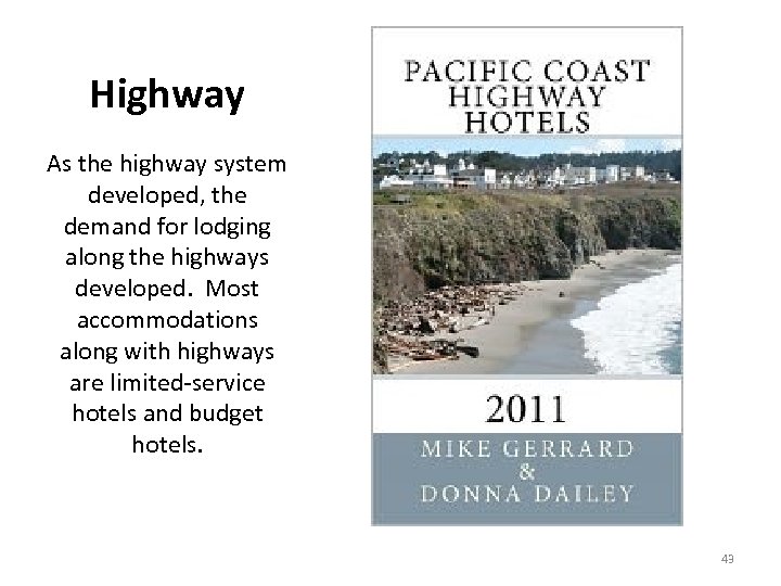 Highway As the highway system developed, the demand for lodging along the highways developed. Most accommodations along with highways are limited-service hotels and budget hotels. 43