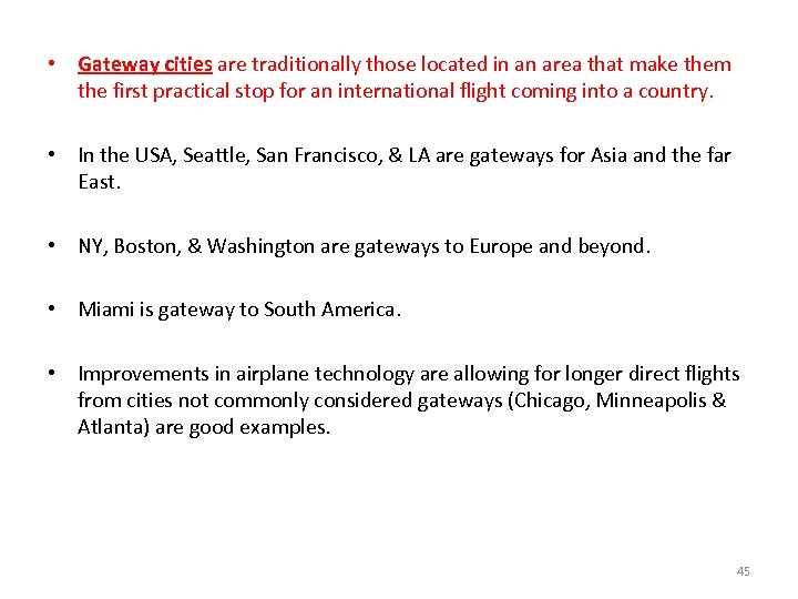 • Gateway cities are traditionally those located in an area that make them the first practical stop for an international flight coming into a country. • In the USA, Seattle, San Francisco, & LA are gateways for Asia and the far East. • NY, Boston, & Washington are gateways to Europe and beyond. • Miami is gateway to South America. • Improvements in airplane technology are allowing for longer direct flights from cities not commonly considered gateways (Chicago, Minneapolis & Atlanta) are good examples. 45