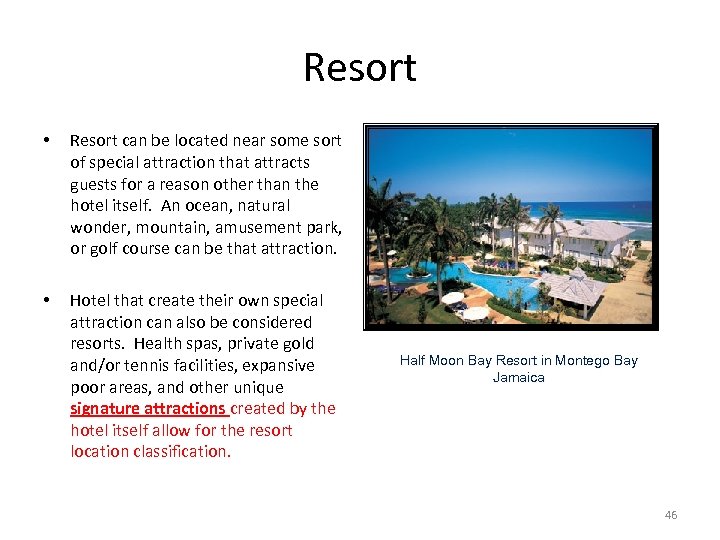 Resort • Resort can be located near some sort of special attraction that attracts guests for a reason other than the hotel itself. An ocean, natural wonder, mountain, amusement park, or golf course can be that attraction. • Hotel that create their own special attraction can also be considered resorts. Health spas, private gold and/or tennis facilities, expansive poor areas, and other unique signature attractions created by the hotel itself allow for the resort location classification. Half Moon Bay Resort in Montego Bay Jamaica 46