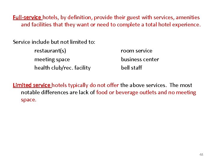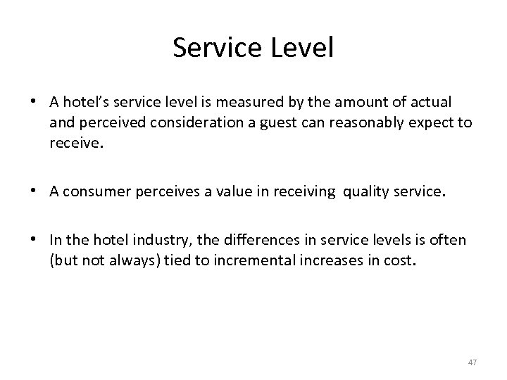 Service Level • A hotel’s service level is measured by the amount of actual and perceived consideration a guest can reasonably expect to receive. • A consumer perceives a value in receiving quality service. • In the hotel industry, the differences in service levels is often (but not always) tied to incremental increases in cost. 47