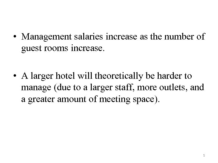 • Management salaries increase as the number of guest rooms increase. • A larger hotel will theoretically be harder to manage (due to a larger staff, more outlets, and a greater amount of meeting space). 5