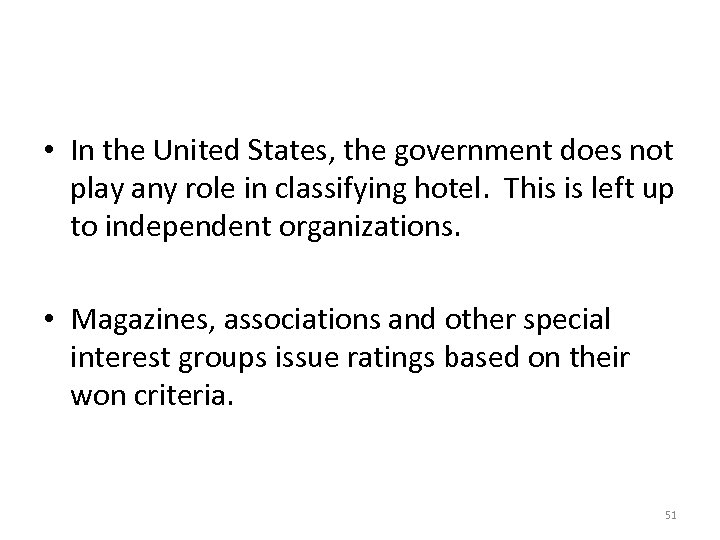 • In the United States, the government does not play any role in classifying hotel. This is left up to independent organizations. • Magazines, associations and other special interest groups issue ratings based on their won criteria. 51
