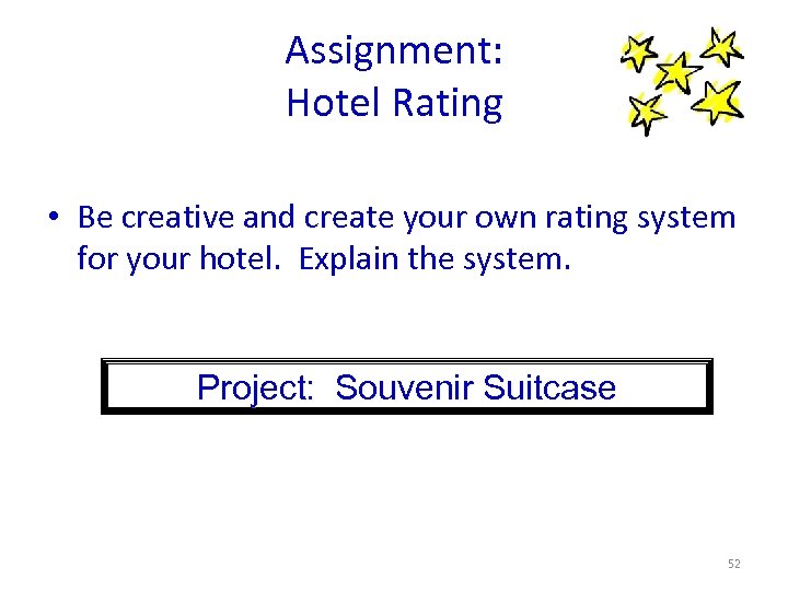 Assignment: Hotel Rating • Be creative and create your own rating system for your hotel. Explain the system. Project: Souvenir Suitcase 52