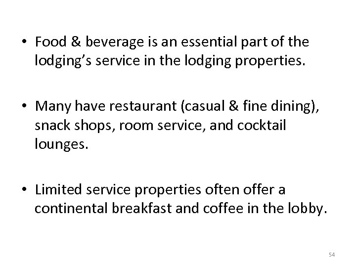 • Food & beverage is an essential part of the lodging’s service in the lodging properties. • Many have restaurant (casual & fine dining), snack shops, room service, and cocktail lounges. • Limited service properties often offer a continental breakfast and coffee in the lobby. 54