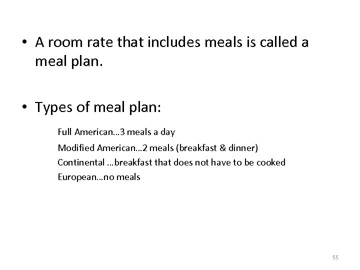 • A room rate that includes meals is called a meal plan. • Types of meal plan: Full American… 3 meals a day Modified American… 2 meals (breakfast & dinner) Continental …breakfast that does not have to be cooked European…no meals 55
