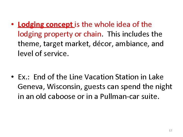 • Lodging concept is the whole idea of the lodging property or chain. This includes theme, target market, décor, ambiance, and level of service. • Ex. : End of the Line Vacation Station in Lake Geneva, Wisconsin, guests can spend the night in an old caboose or in a Pullman-car suite. 57