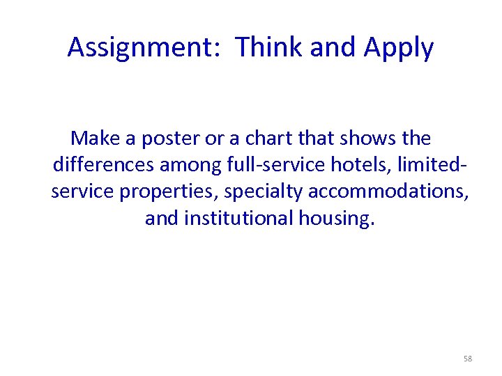 Assignment: Think and Apply Make a poster or a chart that shows the differences among full-service hotels, limitedservice properties, specialty accommodations, and institutional housing. 58