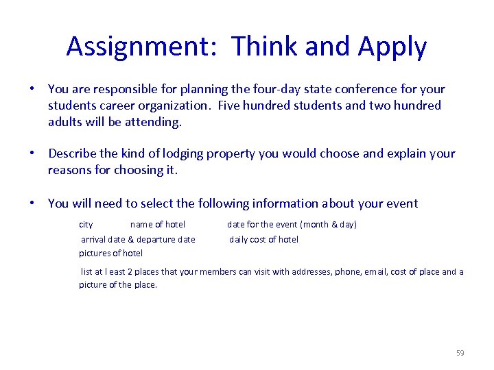 Assignment: Think and Apply • You are responsible for planning the four-day state conference for your students career organization. Five hundred students and two hundred adults will be attending. • Describe the kind of lodging property you would choose and explain your reasons for choosing it. • You will need to select the following information about your event city name of hotel arrival date & departure date pictures of hotel date for the event (month & day) daily cost of hotel list at l east 2 places that your members can visit with addresses, phone, email, cost of place and a picture of the place. 59