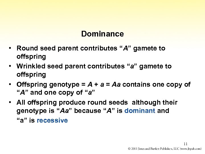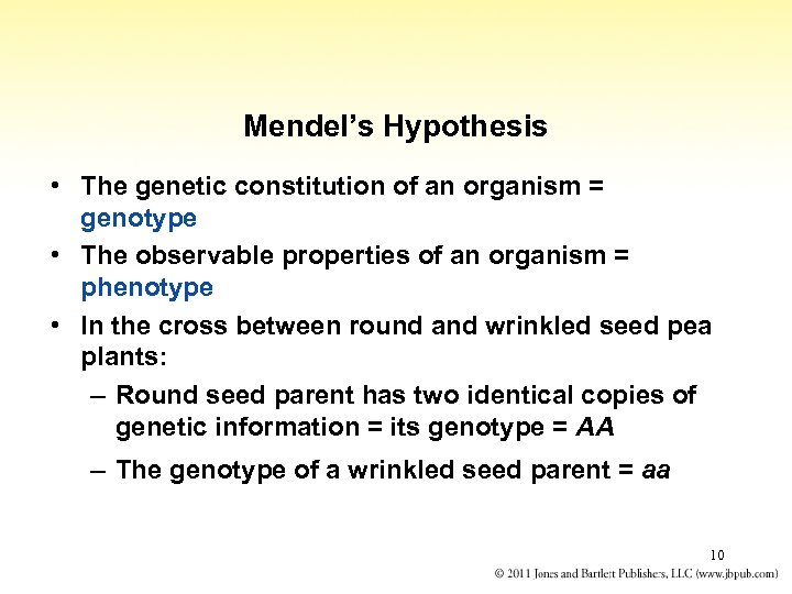 Mendel’s Hypothesis • The genetic constitution of an organism = genotype • The observable properties of an organism = phenotype • In the cross between round and wrinkled seed pea plants: – Round seed parent has two identical copies of genetic information = its genotype = AA – The genotype of a wrinkled seed parent = aa 10