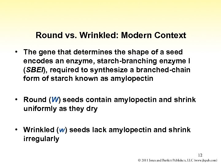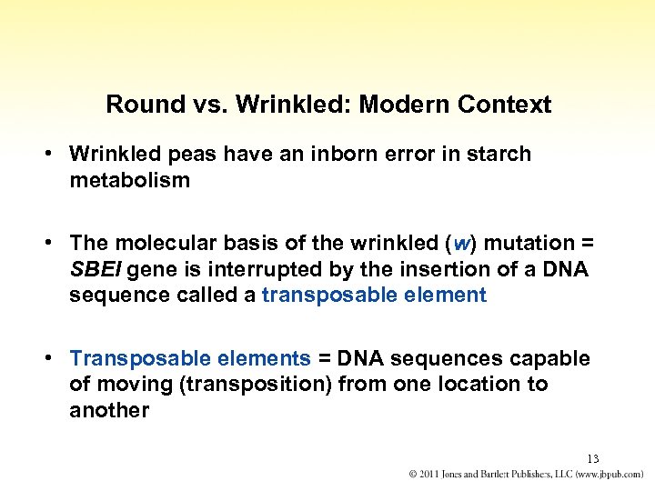 Round vs. Wrinkled: Modern Context • The gene that determines the shape of a seed encodes an enzyme, starch-branching enzyme I (SBEI), required to synthesize a branched-chain form of starch known as amylopectin • Round (W) seeds contain amylopectin and shrink uniformly as they dry • Wrinkled (w) seeds lack amylopectin and shrink irregularly 12