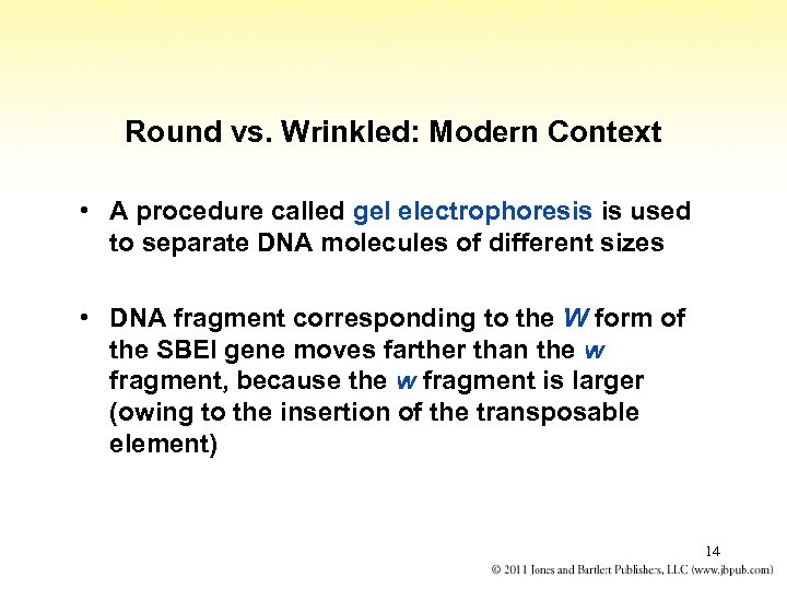 Round vs. Wrinkled: Modern Context • Wrinkled peas have an inborn error in starch metabolism • The molecular basis of the wrinkled (w) mutation = SBEI gene is interrupted by the insertion of a DNA sequence called a transposable element • Transposable elements = DNA sequences capable of moving (transposition) from one location to another 13