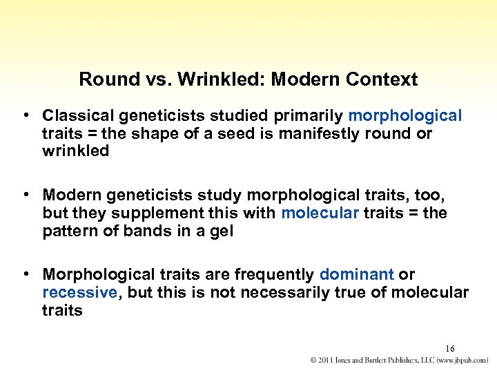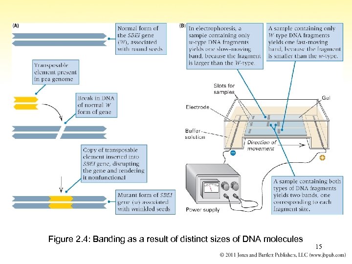 Round vs. Wrinkled: Modern Context • A procedure called gel electrophoresis is used to separate DNA molecules of different sizes • DNA fragment corresponding to the W form of the SBEI gene moves farther than the w fragment, because the w fragment is larger (owing to the insertion of the transposable element) 14