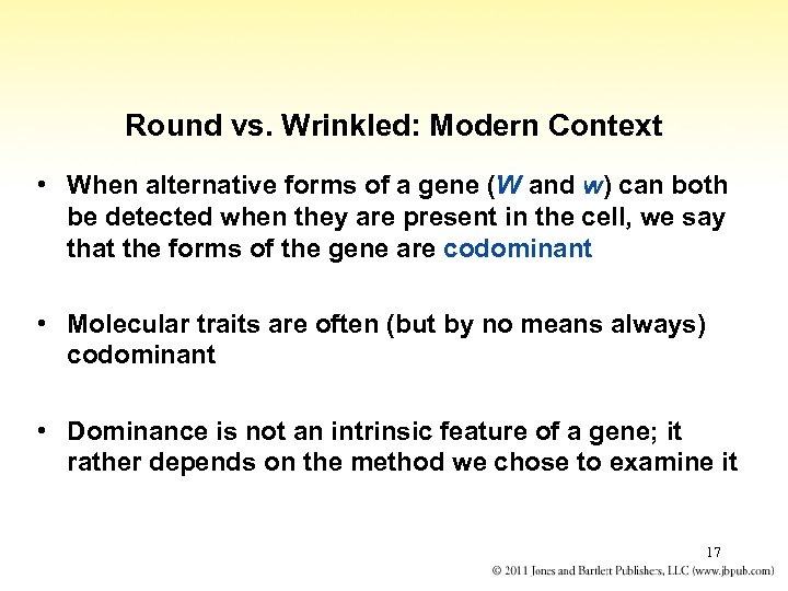 Round vs. Wrinkled: Modern Context • Classical geneticists studied primarily morphological traits = the shape of a seed is manifestly round or wrinkled • Modern geneticists study morphological traits, too, but they supplement this with molecular traits = the pattern of bands in a gel • Morphological traits are frequently dominant or recessive, but this is not necessarily true of molecular traits 16