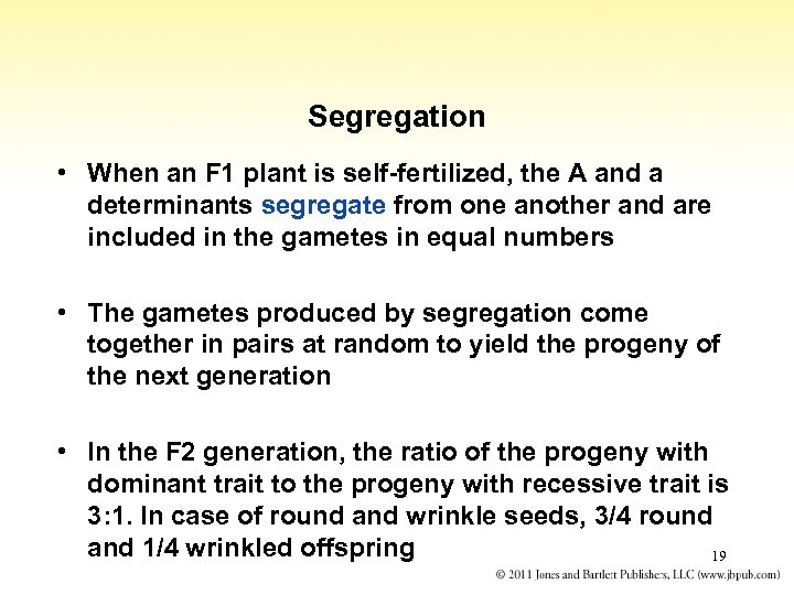 Segregation • When an F 1 plant is self-fertilized, the A and a determinants segregate from one another and are included in the gametes in equal numbers • The gametes produced by segregation come together in pairs at random to yield the progeny of the next generation • In the F 2 generation, the ratio of the progeny with dominant trait to the progeny with recessive trait is 3: 1. In case of round and wrinkle seeds, 3/4 round and 1/4 wrinkled offspring 19