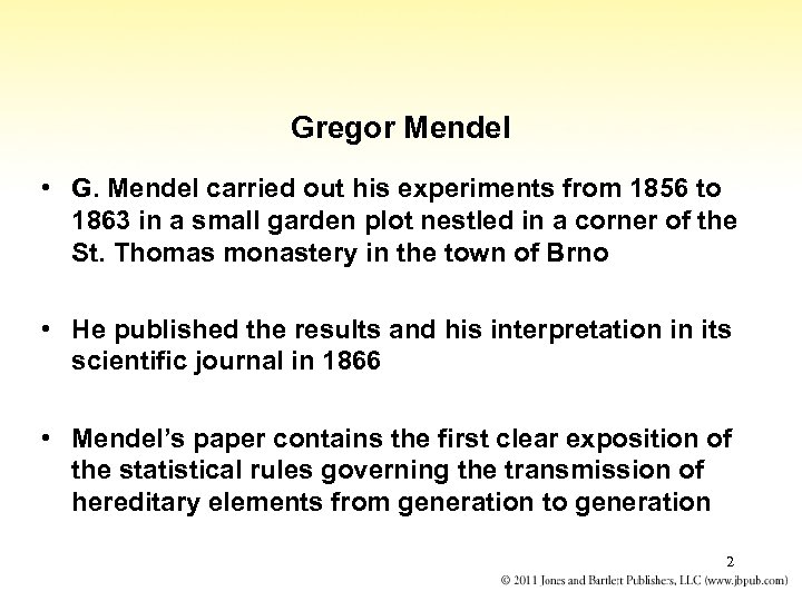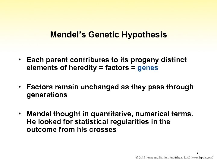 Gregor Mendel • G. Mendel carried out his experiments from 1856 to 1863 in a small garden plot nestled in a corner of the St. Thomas monastery in the town of Brno • He published the results and his interpretation in its scientific journal in 1866 • Mendel’s paper contains the first clear exposition of the statistical rules governing the transmission of hereditary elements from generation to generation 2