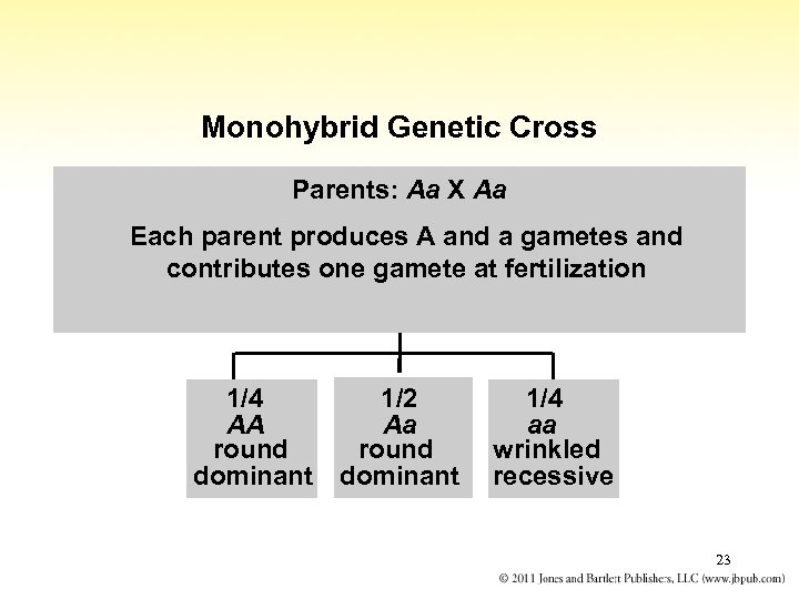 Monohybrid Genetic Cross Parents: Aa X Aa Each parent produces A and a gametes and contributes one gamete at fertilization 1/4 AA round dominant 1/2 Aa round dominant 1/4 aa wrinkled recessive 23