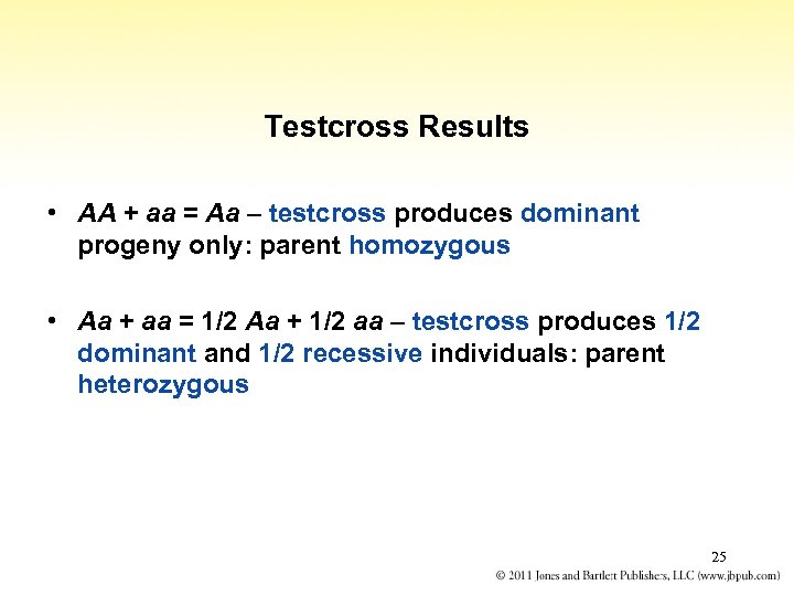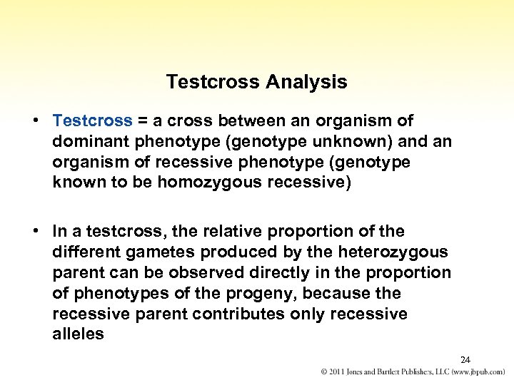 Testcross Analysis • Testcross = a cross between an organism of dominant phenotype (genotype unknown) and an organism of recessive phenotype (genotype known to be homozygous recessive) • In a testcross, the relative proportion of the different gametes produced by the heterozygous parent can be observed directly in the proportion of phenotypes of the progeny, because the recessive parent contributes only recessive alleles 24