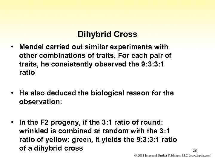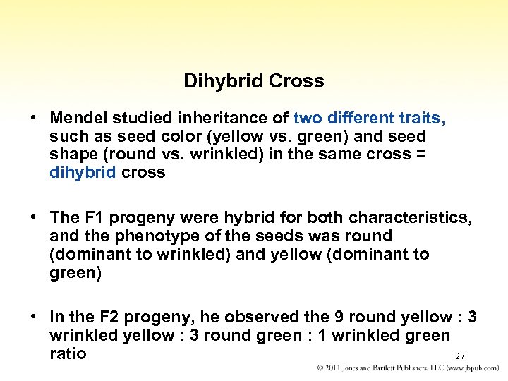 Dihybrid Cross • Mendel studied inheritance of two different traits, such as seed color (yellow vs. green) and seed shape (round vs. wrinkled) in the same cross = dihybrid cross • The F 1 progeny were hybrid for both characteristics, and the phenotype of the seeds was round (dominant to wrinkled) and yellow (dominant to green) • In the F 2 progeny, he observed the 9 round yellow : 3 wrinkled yellow : 3 round green : 1 wrinkled green ratio 27