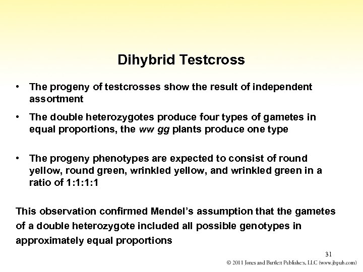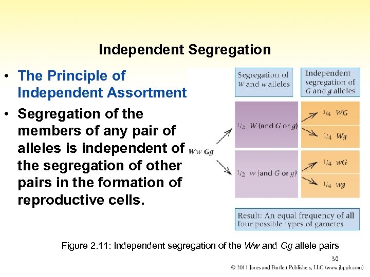 Independent Segregation • The Principle of Independent Assortment: • Segregation of the members of any pair of alleles is independent of the segregation of other pairs in the formation of reproductive cells. Figure 2. 11: Independent segregation of the Ww and Gg allele pairs 30
