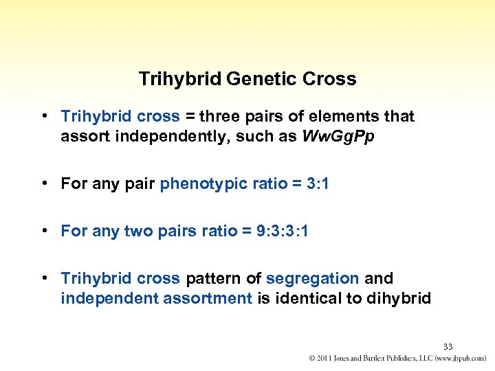 Trihybrid Genetic Cross • Trihybrid cross = three pairs of elements that assort independently, such as Ww. Gg. Pp • For any pair phenotypic ratio = 3: 1 • For any two pairs ratio = 9: 3: 3: 1 • Trihybrid cross pattern of segregation and independent assortment is identical to dihybrid 33