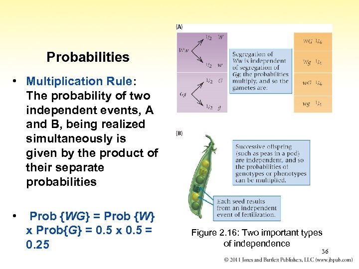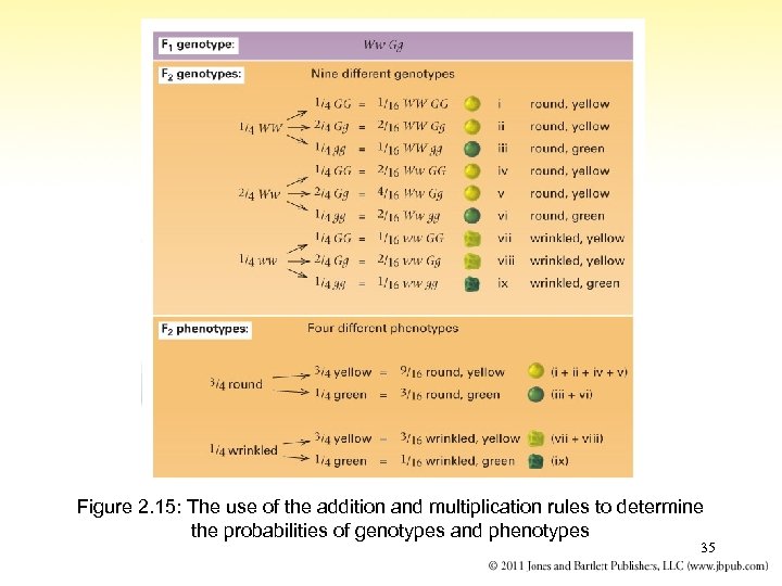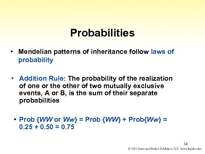 Probabilities • Mendelian patterns of inheritance follow laws of probability • Addition Rule: The probability of the realization of one or the other of two mutually exclusive events, A or B, is the sum of their separate probabilities • Prob {WW or Ww} = Prob {WW} + Prob{Ww} = 0. 25 + 0. 50 = 0. 75 34