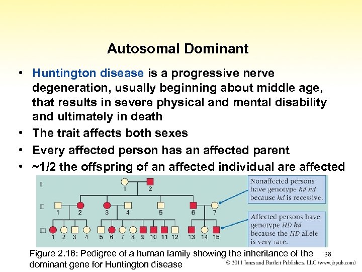 Autosomal Dominant • Huntington disease is a progressive nerve degeneration, usually beginning about middle age, that results in severe physical and mental disability and ultimately in death • The trait affects both sexes • Every affected person has an affected parent • ~1/2 the offspring of an affected individual are affected Figure 2. 18: Pedigree of a human family showing the inheritance of the dominant gene for Huntington disease 38