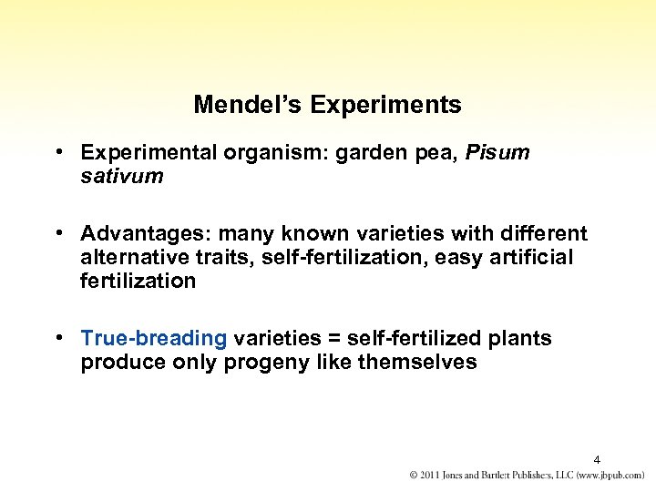Mendel’s Genetic Hypothesis • Each parent contributes to its progeny distinct elements of heredity = factors = genes • Factors remain unchanged as they pass through generations • Mendel thought in quantitative, numerical terms. He looked for statistical regularities in the outcome from his crosses 3